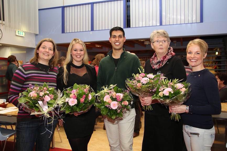 Tijdens de nieuwjaarsreceptie van woensdag 7 januari werden vijf jubilarissen gehuldigd. Zij kregen de erepenning voor het bereiken van een memorabele mijlpaal op het gebied van lidmaatschap. Van links naar rechts: Nelly Uitslag 12.5 jaar, Mellanie van der Sluys, 12.5 jaar, Ben van Bruggen 12.5 jaar, Joke Rens 50 jaar en Jenine Groothuis 25 jaar.