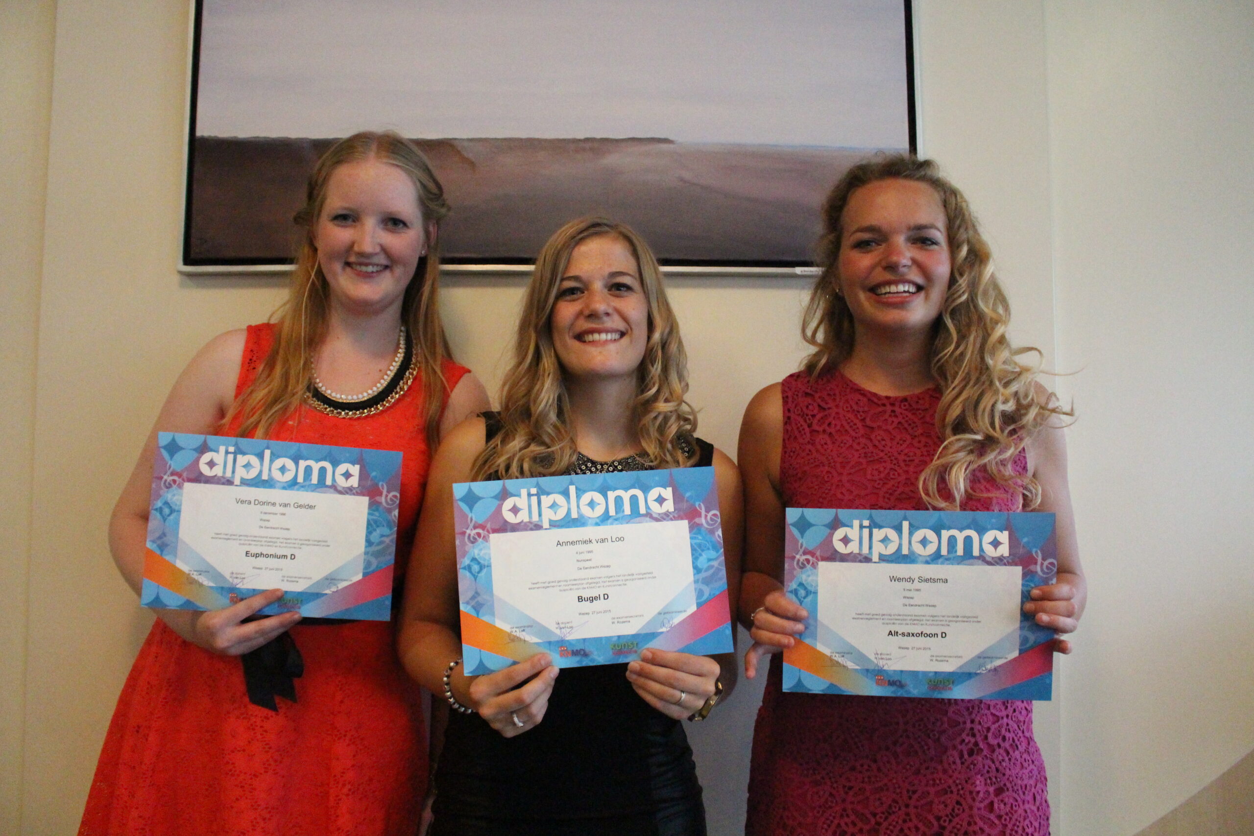 ’s Avonds concerteerden de drie D-kandidaten met het A-orkest van De Eendracht in de Kruiskerk in Wezep. Tijdens dit concert brachten zij twee werken ten gehore met begeleiding, waarvan een uit het hoofd. Vera van Gelder (18 jaar, euphonium) soleerde in ‘Twilight Serenade’ en ‘Gabriela’s song’. Annemiek van Loo (20 jaar, bugel) schitterde in ‘Introduction and Caprice’ en ‘Over the rainbow’. Wendy Sietsma (19 jaar, alt-saxofoon) weerklonk in ‘Bam-bam’ en ‘…’. De examinator kwam vervolgens snel met de verlossende uitslag: Vera van Gelder werd gewaardeerd met 54 punten, Annemiek van Loo eveneens met 54 punten en Wendy Sietsma kon 54,5 punten in de tas stoppen. Alle drie cum laude geslaagd! Examinator Loff benadrukte hoe uniek deze avond was: “Doorgaans doen hooguit twee leden D-examen en nu drie en dan ook nog alle drie extreem goed!”