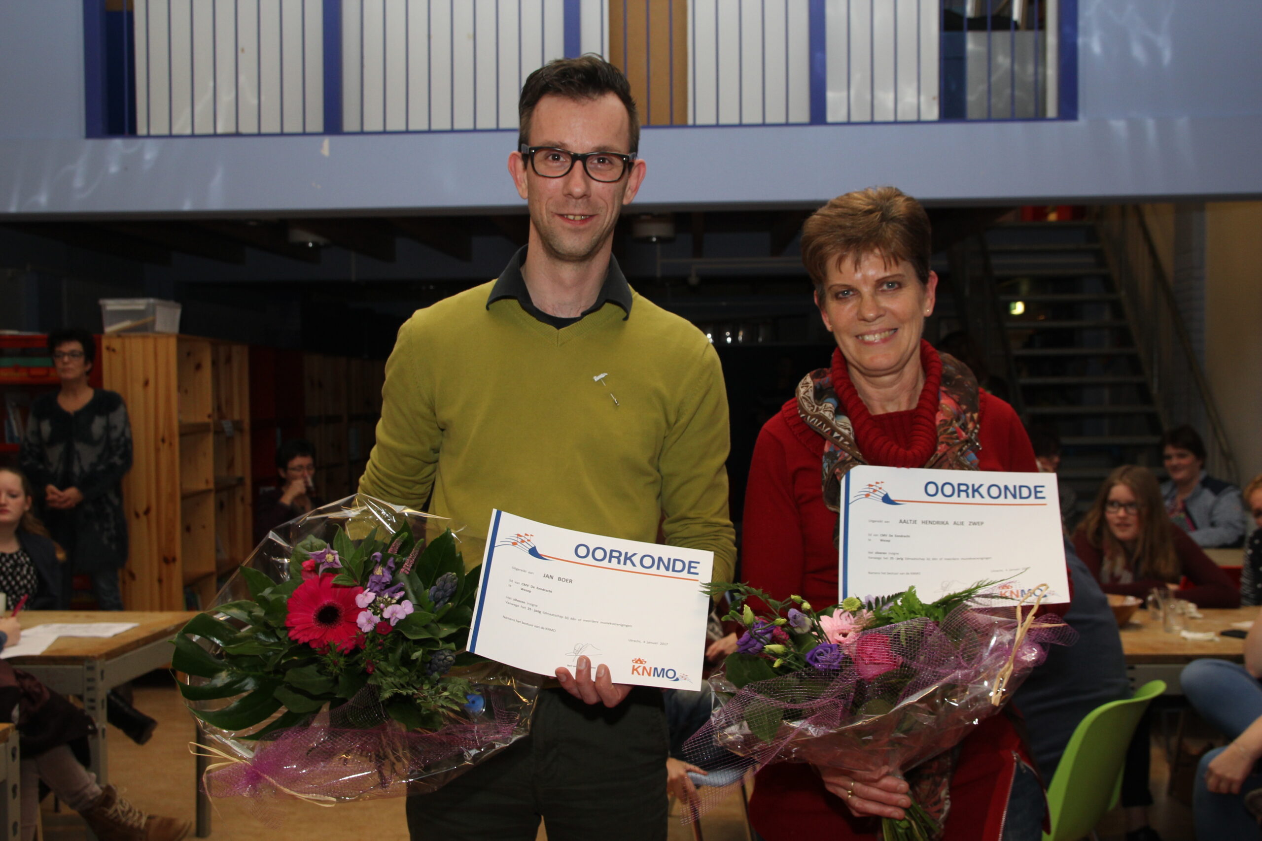 Jan Boer en Alie Zwep musiceren al 25 jaar met veel plezier bij De Eendracht, Jan de laatste jaren op bes bas en Alie op saxofoon. Ze ontvingen beiden een zilveren speld en oorkonde van de Koninklijke Nederlandse Muziek Organisatie (KNMO).